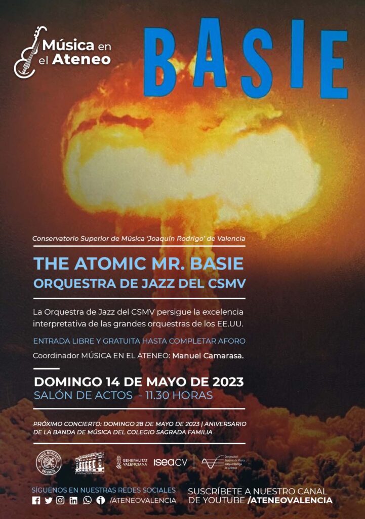La Fundación del Ateneo Mercantil de la CV y el Conservatorio Superior de Música 'Joaquín Rodrigo' de Valencia organizan un nuevo concierto gratuito en el Teatro Ateneo el próximo domingo 14 de mayo a las 11.30 horas. En esta ocasión el concierto será de la ORQUESTRA DE JAZZ DEL CSMV 'THE ATOMIC MR. BASIE'.