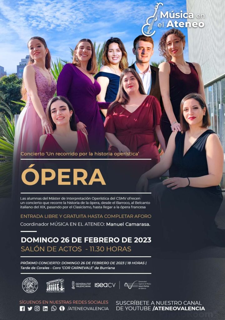 La Fundación Ateneo Mercantil de Valencia en colaboración con el Conservatorio Superior de Música 'Joaquín Rodrigo' de Valencia han programado un nuevo concierto gratuito dentro del ciclo 'Música en el Ateneo' para el próximo domingo 26 de febrero de 2023 a las 11.30 horas en el Teatro Auditorio del Ateneo Mercantil. En esta ocasión las alumnas del Máster de Interpretación Operística del CSMV ofrecerán un concierto que hará un recorrido por toda la historia de la ópera.