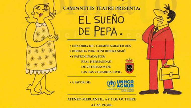 La compañía amateur Campanetes Teatre presenta como es habitual en su trayectoria, la obra con fines solidarios 'El Sueño de Pepa' cuya recaudación (desde 6 €) irá destinada a ACNUR para ayudar a los refugiados. Una comedia agradable para todos los públicos, escrita por Carmen Sabater Rex, dirigida por Toni Ribera Simó, e interpretada por la propia Carmen Sabater, Lola Ramírez, Peter Finnegan, Marisa Hernández,Cristina Ferriol, Mario Javier Poyo y Eva Mireya, además de contar con la presencia de un pianista en directo.