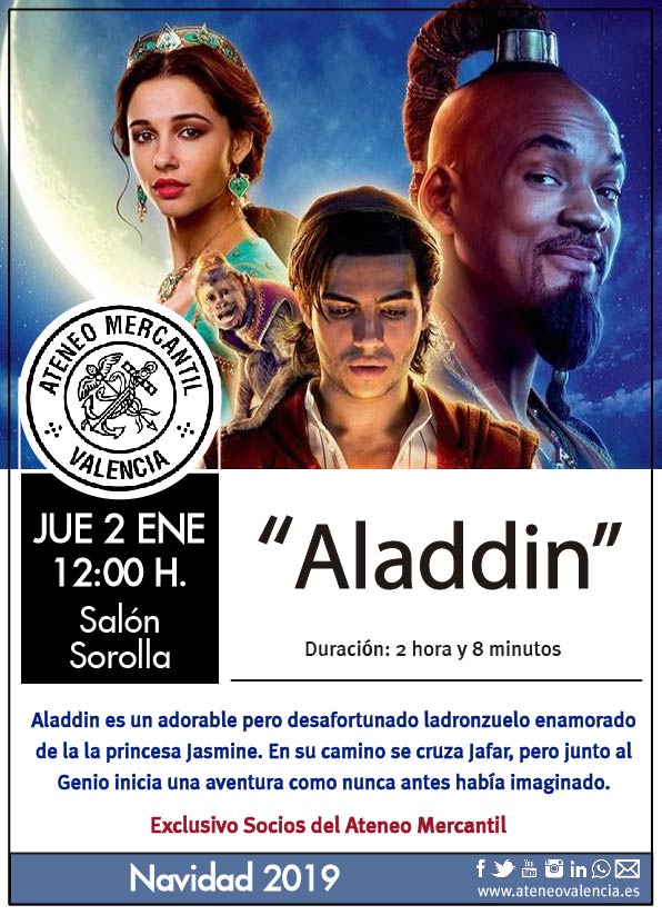La apuesta por el cinde de animación volverá a ser una de los ejes centrales para nuestros niños y niñas ateneístas y este año se podrán ver cinco películas, cuatro en horario de mañana y una por la tarde. La quinta película escogida es "Aladdin" y podrá verse el jueves 2 de enero a las 12 horas en el Salón Sorolla. Una película para todos los públicos y una de las mejores versiones en imagen fotorrealista producidas por Disney a partir de sus clásicos animados.