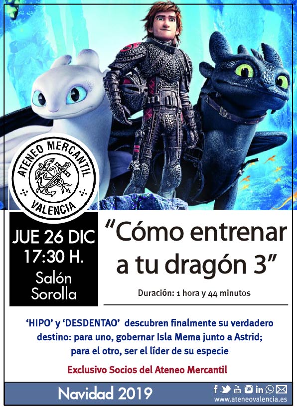 La apuesta por el cinde de animación volverá a ser una de los ejes centrales para nuestros niños y niñas ateneístas y este año se podrán ver cinco películas, cuatro en horario de mañana y una por la tarde. La segunda película escogida es "Cómo entrenar a tu dragón 3" y podrá verse el jueves 26 de diciembre a las 17.30 horas en el Salón Sorolla. Una película para todos los públicos y que cierra la trilogía de la amistad de un joven vikingo y el dragón Furia Nocturna.