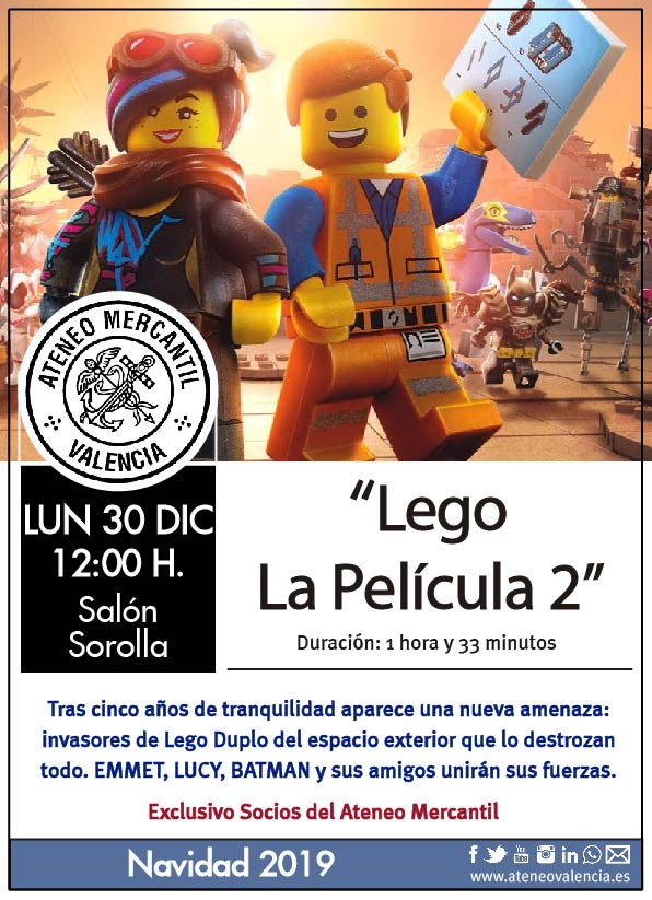 La apuesta por el cinde de animación volverá a ser una de los ejes centrales para nuestros niños y niñas ateneístas y este año se podrán ver cinco películas, cuatro en horario de mañana y una por la tarde. La cuarta película escogida es "Lego La Película 2" y podrá verse el lunes 30 de diciembre a las 12 horas en el Salón Sorolla. Una película para todos los públicos y que trae una historia de continuación de la primera película del universo cinematográfico de Lego.