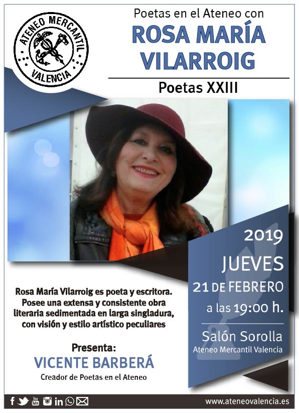 El próximo encuentro de Poetas en el Ateneo será el próximo jueves 21 de febrero en el Salón Sorolla a las 19 horas. La invitada es la poeta y escritora, Rosa María Vilarroig Colomé, quien posee una extensa y consistente obra literaria sedimentada en larga singladura, con visión y estilo artístico peculiares.