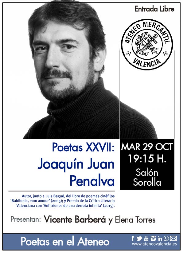 Tras las vacaciones de verano regresa al Salón Sorolla un nuevo protagonista de Poetas en el Ateneo, el vigésimo séptimo poeta que desfila por el Salón Sorolla para contar su vida y obras. En esta ocasión será el alicantino Joaquín Juan Penalva, autor, junto a Luis Bagué, del libro de poemas cinéfilos Babilonia, mon amour (2005), obtuvo el Premio de la Crítica Literaria Valenciana con Anfitriones de una derrota infinita (2015).