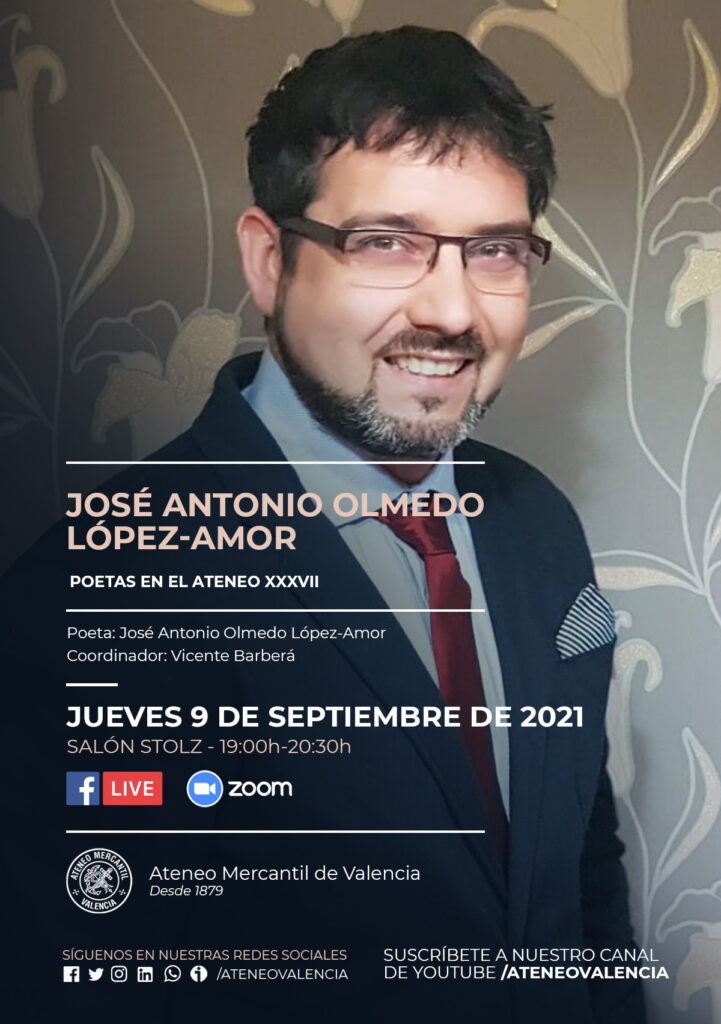 Una nueva reunión del Ciclo Poetas en el Ateneo llega el próximo jueves 9 de septiembre a las 19 horas en el Salón Stolz con el poeta José Antonio Olmedo López-Amor, que fue el ganador del III Certamen Nacional de Poesía Ateneo Mercantil de Valencia en 2019. Un encuentro que contará con la presencia del coordinador del ciclo, Vicente Barberá.