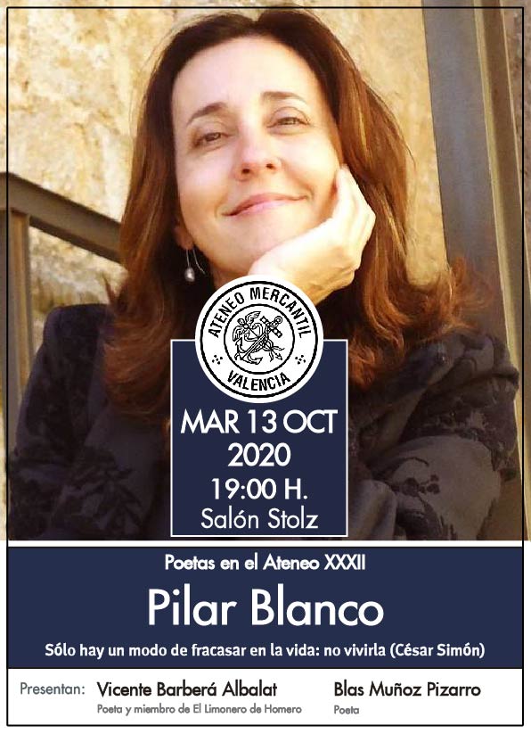 Nueva sesión de Poetas en el Ateneo, la trigésmo segunda, que contará con la presencia de la poeta Pilar Blanco Díaz, el próximo martes 13 de octubre a las 19.00 horas en el Salón Stolz del Ateneo Mercantil. Pilar Blanco es una poeta que ha recibido distintos premios de poesía entre los que se encuentran el "Francisco Quevedo". Profesora de Lengua y Literatura, Poeta con mayúsculas, inventora de lenguaje ya que le encanta jugar con las palabras, autora de un buen número de poemarios.