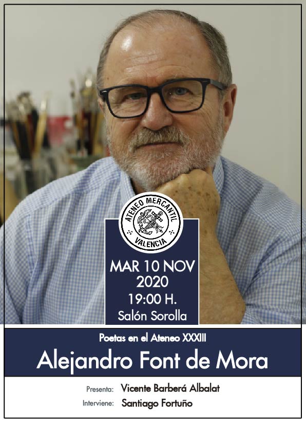 El Ciclo de Poetas en el Ateneo regresa el próximo martes 10 de noviembre a las 19 horas en el Salón Sorolla del Ateneo Mercantil con una nueva reunión, la trigésimo tercera, que traerá hasta nuestra institución al poeta Alejandro Font de Mora. Un acto que está coordinado y presentado por el poeta Vicente Barbera y en el que intervendrá el también poeta y catedrático de Literatura Española en la Universidad Jaume I, el profesor Santiago Fortuño.