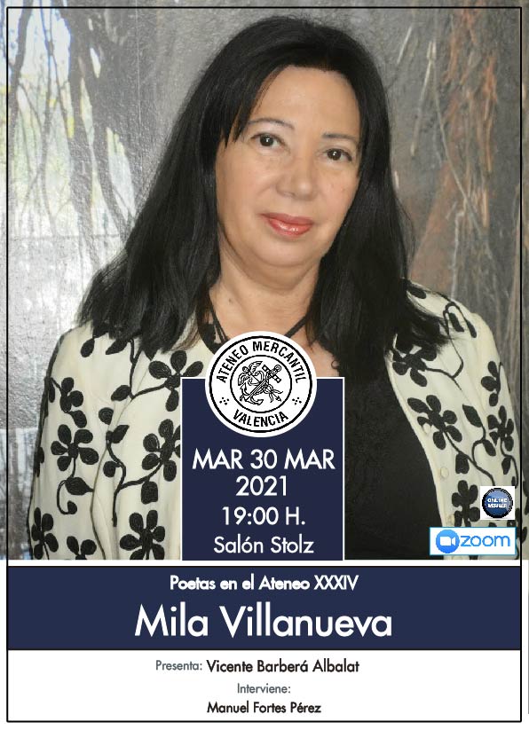 Nueva sesión de Poetas en el Ateneo, la trigésmo cuarta, que contará con la presencia de la poeta, escritora y gestora cultural, Mila Villanueva. La conferencia será el próximo martes 30 de marzo a las 19 horas en el Salón Stolz y se realizará también online. El acto lo presentarán el creador de Poetas en el Ateneo, Vicente Barberá, e intervendrá el poeta, Manuel Fortes.