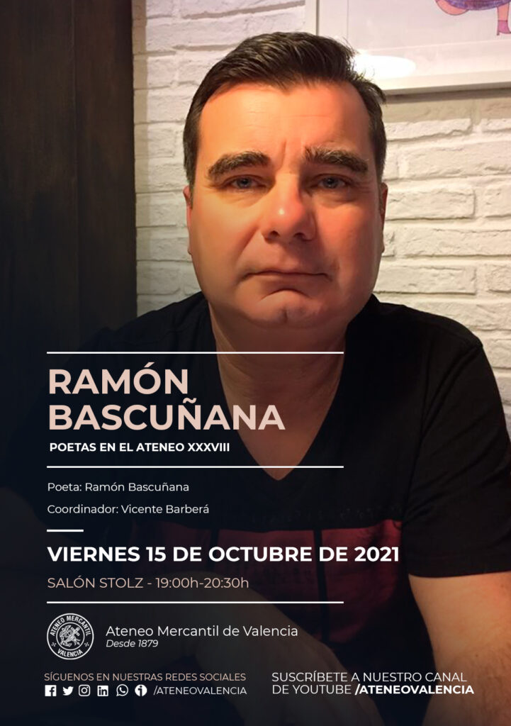 Nueva reunión del Ciclo Poetas en el Ateneo que contará con la presencia del poeta alicantino Ramón Bascuñana. Así el próximo viernes 15 de octubre a las 19 horas en el Salón Stolz se celebrará la XXXVIII reunión de poetas en nuestra casa. El poeta será entrevistado por el coordinador del ciclo, Vicente Barberá.