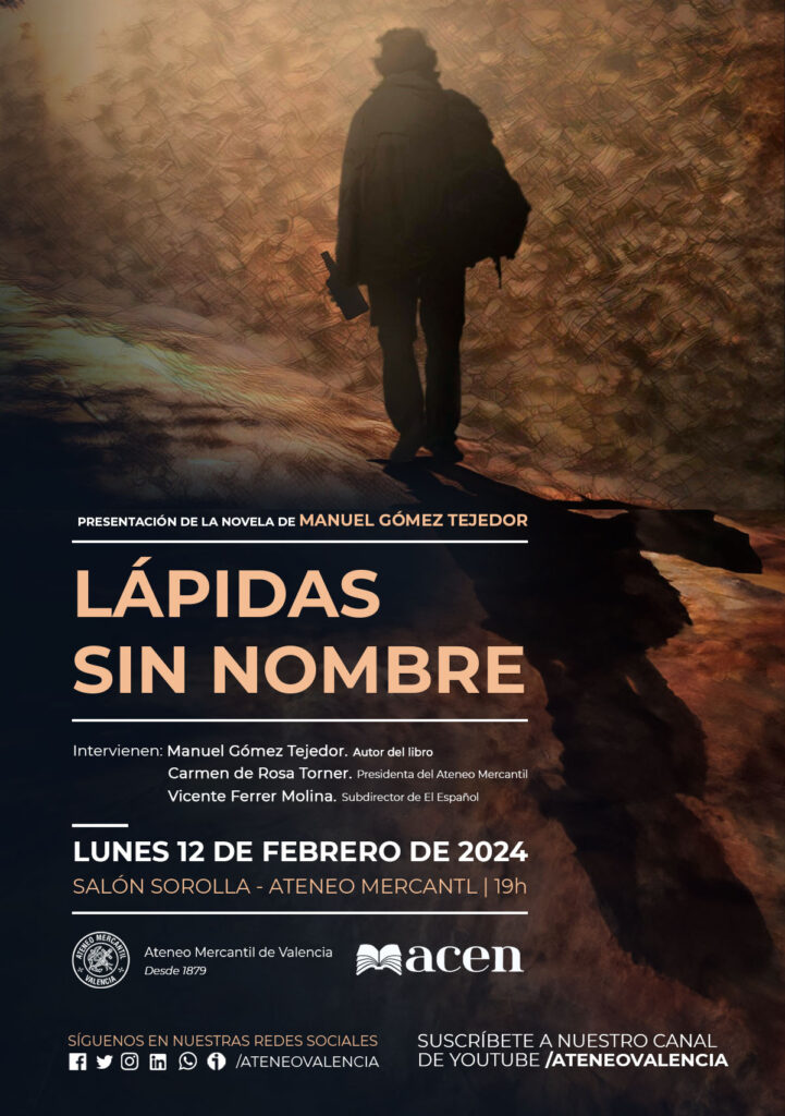 El Ateneo Mercantil en colaboración con la Editorial Acen presentan la novela "Lápidas sin nombre" de Manuel Gómez Tejedor en el Salón Sorolla el próximo lunes 12 de febrero a las 19 horas. Un acto que contará con la presencia del autor del libro, pero además, estará acompañado en la mesa por la presidenta del Ateneo Mercantil, Carmen de Rosa Torner y por el subdirector de El Español, Vicente Ferrer Molina.
