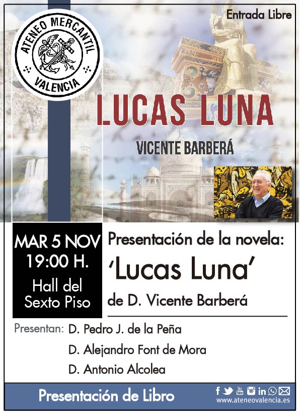 El próximo martes 5 de noviembre (19 horas) se presenta en la sexta planta del Ateneo Mercantil de Valencia la novela 'Lucas Luna' de D. Vicente Barberá. El último libro de un gran amante de la vida y de la poesía, que esta vez ha dado el salto a la novela. Si el pasado año presentó dos poemarios, "Flor en el agua" y "Después del amor" y ahora llega 'Lucas Luna'.