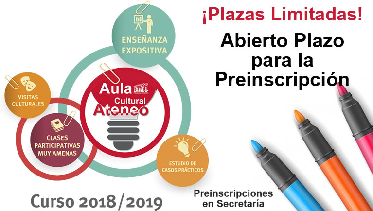 Hay que recordar a la gente que esté interesada que está abierto el plazo de Preinscripción del Aula Cultural: el pago es de 50 euros para reservar tu plaza en las aulas. Con este sistema de aprendizaje se busca favorecer la socialización de los alumnos y el intercambio cultural, propósito que ha dado magníficos resultados en las ediciones anteriores. El Aula Cultural Ateneo Mercantil de Valencia es la mejor propuesta de aprendizaje para mayores de 50 años de la ciudad de Valencia, ya que cuenta con un gran nivel de profesorado y actividades prácticas en colaboración con el Ayuntamiento de Valencia y otras instituciones valencianas.