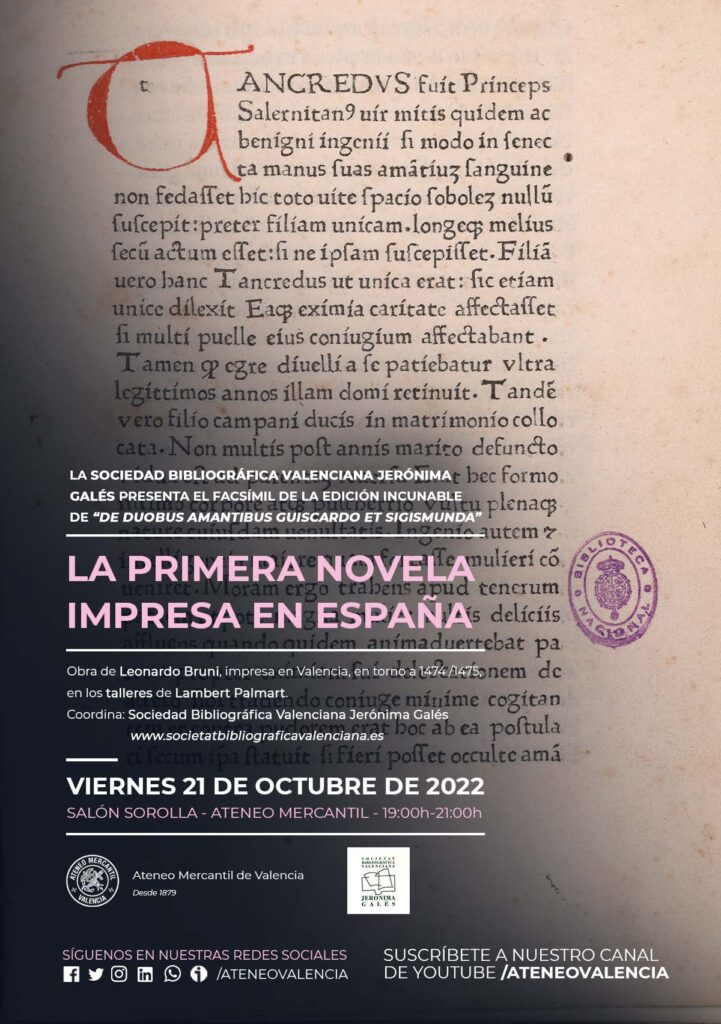 El próximo viernes 21 de octubre a las 19 horas en el Salón Sorolla del Ateneo Mercantil de Valencia, la Sociedad Bibliográfica Valenciana Jerónima Galés presenta el facsímil de la edición incunable de "De duobus amantibus Guiscardo et Sigismunda", obra de Leonardo Bruni, impresa en Valencia, en torno al 1474/1475, en los talleres de Lambert Palmart. Primera novela impresa en España.