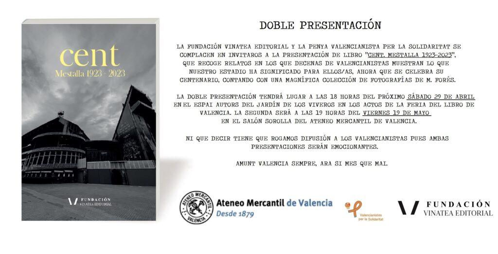 La Fundación Vinatea Editorial ha organizado la presentación de un nuevo libro con fines solidarios el próximo viernes 19 de mayo a las 19 horas en el Salón Sorolla del Ateneo Mercantil. La obra de título "Cent" en la que se rinde homenaje al estadio de Mestalla, que cumple 100 años este 2023. Todos los beneficios de la FUNDACIÓN VINATEA EDITORIAL nutren los diferentes proyectos solidarios de niños y niñas en riesgo de exclusión, en los que colaboran y con los de la O.N.G. Valencianistes per la Solidaritat.