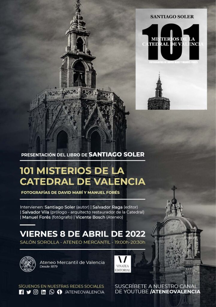 El próximo viernes 8 de abril a las 19 horas en el Salón Sorolla del Ateneo Mercantil se presenta el libro "101 misterios de la Catedral de Valencia" de Santiago Soler y editado por Editorial Vinatea. En el acto intervendrán Santiago Soler (autor), Salvador Raga (editor), Salvador Vila (prólogo - arquitecto restaurador de la Catedral), Manuel Forés (fotógrafo del libro) y Vicente Bosch (Bibliotecario del Ateneo Mercantil).