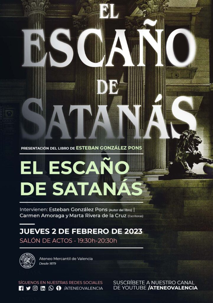 Tras la suspensión del acto el pasado mes de diciembre, el Aula Las Provincias regresa al Ateneo Mercantil con la presentación del libro de Esteban González Pons "El Escaño de Satanás" que será el próximo jueves 2 de febrero de 2023 a las 19.30 horas en el Salón de Actos del Ateneo Mercantil de Valencia. Participan en el acto el autor de la obra, Esteban González Pons y las escritoras Carmen Amoraga y Marta Rivera de la Cruz. Además, el acto contará con la participación de la compañía teatral La máquina: Gretel Stuyck y Rafa Cruz.