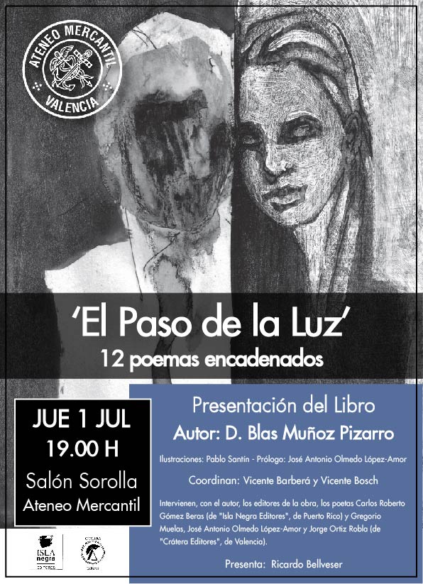 El próximo jueves 1 de julio a las 19 horas se presenta en el Salón Sorolla del Ateneo Mercantil de Valencia el último libro del poeta y escritor Blas Muñoz Pizarro, "'El Paso de la Luz'. 12 poemas encadenados" de Isla Negra Editores y Crátera Editores, y que cuenta con ilustraciones de Pablo Santín y el prólogo lo ha realizado el también poeta, José Antonio Olmedo López-Amor. En el acto intervendrán junto al autor, los editores de la obra, los poetas Carlos Roberto Gómez Beras (de "Isla Negra Editores", de Puerto Rico) y Gregorio Muelas, José Antonio Olmedo López-Amor y Jorge Ortiz Robla (de "Crátera Editores", de Valencia). Coordinan el acto Vicente Barberá y Vicente Bosch, mientras que presenta el mismo Ricardo Bellveser.