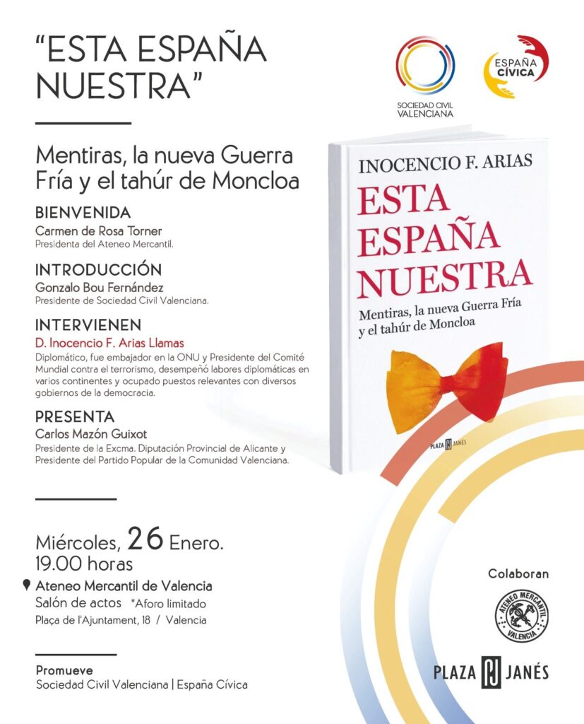 El próximo miércoles 26 de enero a las 19 horas en el Salón de Actos del Ateneo Mercantil llega la presentación del libro de Inocencio Arias, "Esta España nuestra. Mentiras, la nueva Guerra Fría y el tahúr de la Moncloa". El acto tendrá la bienvenida de la presidenta del Ateneo Mercantil, Carmen de Rosa, hará una breve introducción el presidente de Sociedad Civil Valenciana, Gonzalo Bou Fernández y participarán el autor de la obra y diplomático, ex embajador de la ONU y presidente del Comité Mundial contra el Terrorismo, Inocencio Arias Llamas. Presenta el acto, Carlos Mazón Guixot, presidente de la Excma. Diputación de Alicante y presidente del Partido Popular en la Comunidad Valenciana.