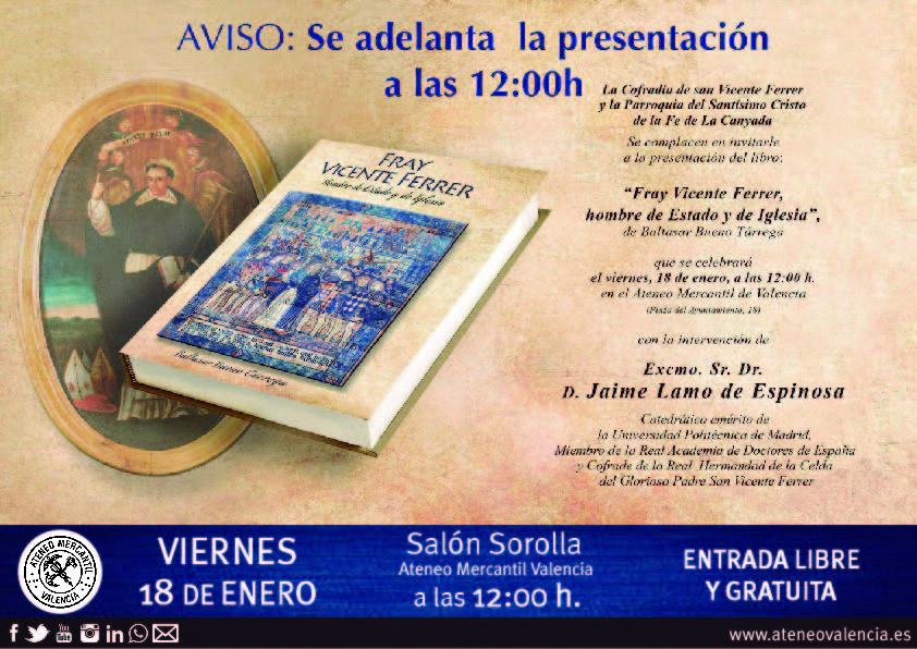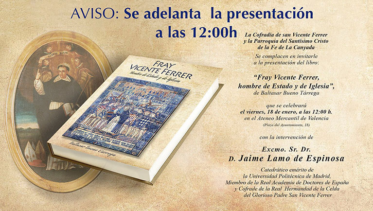La Cofradía de San Vicente Ferrer y la Parroquia del Santísimo Cristo de la Fe de La Canyada han organizado la presentación del libro: “Fray Vicente Ferrer, hombre de Estado y de Iglesia”, redactado por el escritor, periodista y teólogo, D. Baltasar Bueno Tárrega y que ha sido prologado por el cardenal arzobispo de Valencia, D. Antonio Cañizares. La presentación del libro tendrá lugar en el Ateneo Mercantil de Valencia, el próximo viernes 18 de enero a las 12.00 horas en el Salón Sorolla.