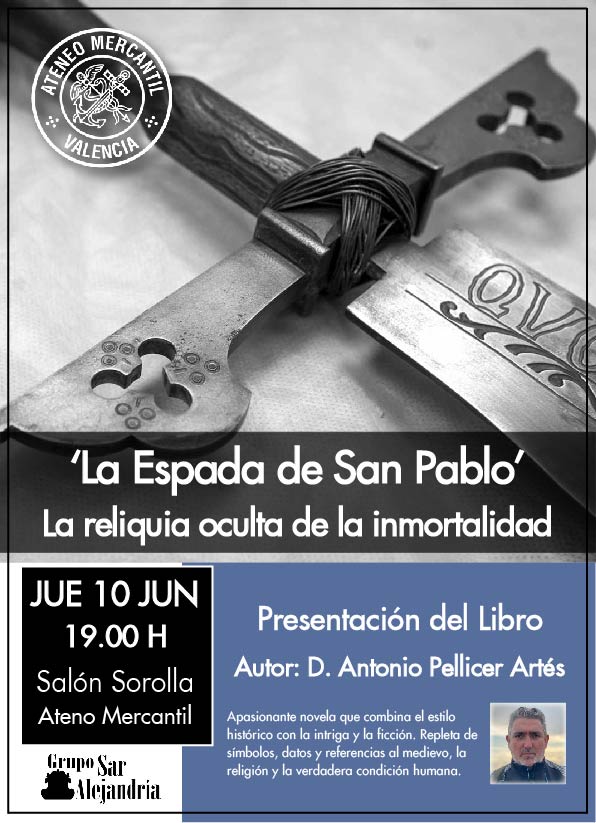 El Ateneo Mercantil de Valencia recibe la visita del escritor Antonio Pellicer Artés el próximo jueves 10 de junio a las 19 horas en el Salón Sorolla para la presentación de su novela "La Espada de San Pablo", un libro que habla de "la reliquia oculta de la inmortalidad". Una apasionante novela que combina el estilo histórico con la intriga y la ficción. Repleta de símbolos, datos y referencias al medievo, la religión y la verdadera condición humana.
