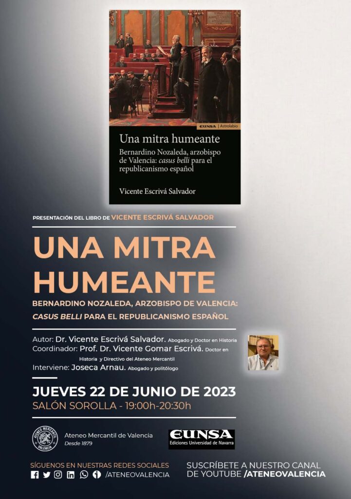 El Ateneo Mercantil de Valencia acoge el próximo jueves 22 de junio de 2023 a las 19 horas la presentación del libro del abogado y doctor en Historia, el Dr. Vicente Escrivá Salvador de la editorial EUNSA. El coordinador del Acto será el directivo del Ateneo Mercantil y también doctor en Historia, Dr. Vicente Gomar Escrivá, y participará el abogado y politólogo, Joseca Arnau.