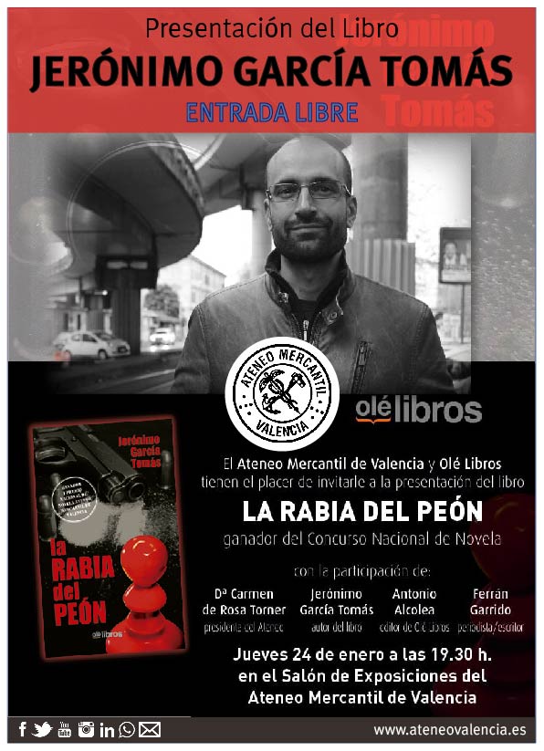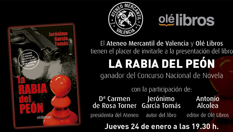 El ganador del Primer Premio Nacional de Novela Ateneo Mercantil de Valencia 2018 presenta su novela 'La rabia del Peón' en la Sala de Exposiciones el próximo jueves 24 de enero a las 19.30 horas. El acto está organizado por el Ateneo Mercantil y la editorial Olelibros.com y contará con la participación de la presidenta del Ateneo, Carmen de Rosa, el autor del libro, Jerónimo García Tomás y el editor de la obra, Antonio Alcolea.