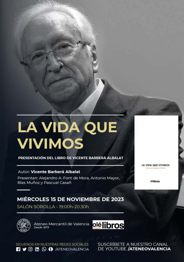 El Ateneo Mercantil de Valencia acoge la presentación del último libro de Vicente Barberá Albalat, el poemario "la vida que vivimos". El miércoles 15 de noviembre a las 19 horas en el Salón Sorolla conoceremos de cerca la última publicación del autor, un acto que estará presentado por tres integrantes del Limonero de Homero: Antonio Mayor, Blas Muñoz y Pascual Casañ.