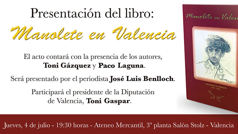 El próximo jueves 4 de julio a las 19.30 horas se presenta en el Salón Stolz del Ateneo Mercantil un libro sobre la vida de Manolete que han escrito dos de las personas que más conocen la figura del legendario torero cordobés, Paco Laguna quien es el mayor experto en la figura de Manuel Rodríguez 'Manolete', y Toni Gázquez, director del Centro de Asuntos Taurinos de la Diputación de Valencia, y un gran amigo de la Tertulia Taurina del Ateneo. El libro de Paco Laguna y Toni Gázquez repasa la vida y la obra del torero cordobés y su presencia y relación con la ciudad de Valencia. Presenta el acto el periodista especializado taurino de Las Provincias y director de la Revista Aplausos, D. José Luis Benlloch.