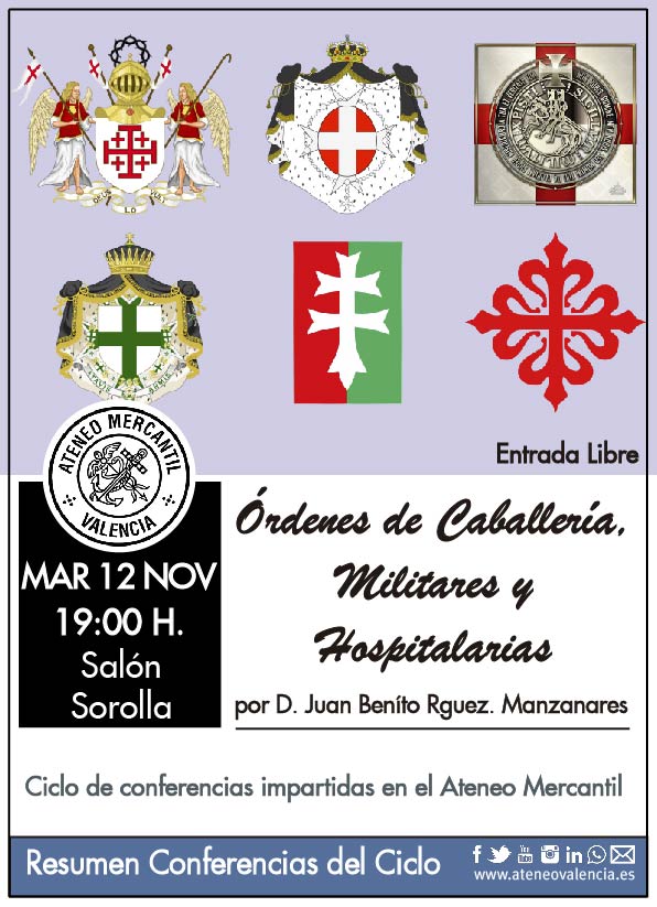 El próximo martes 12 de noviembre a las 19 horas en el Salón Sorolla se presenta una nueva conferencia en la que se hará un resumen de las primeras seis primeras conferencias que D. Juan Benito Rodríguez Manzanares ha realizado en nuestra casa, en el Ateneo Mercantil de Valencia, que componen la primera parte del ciclo dedicado a las Órdenes de Caballería, Militares y Hospitalarias, que se viene realizando desde el pasado mes de octubre de 2018 hasta la acatualidad. Las primeras seis órdenes que se desarrollaron hasta el mes de abril de 2019.