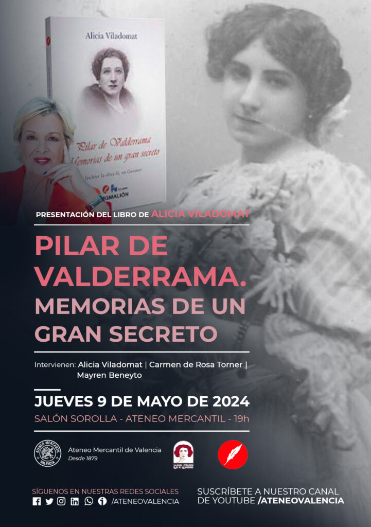 El Ateneo Mercantil de Valencia acoge el próximo martes 9 de mayo, en el Salón Sorolla, la presentación del libro de la escritora Alicia Viladomat, "Pilar de Valderrama. Memorias de un gran secreto", que acerca la figura de la protagonista hasta nuestros días a través de la pluma de su nieta, para que futuras generaciones puedan estudiar a Pilar de Valderrama teniendo un hilo conductor que atraviesa un siglo de nuestra historia.