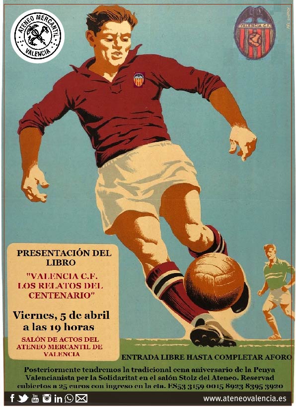Gran presentación del Libro 'Relatos del Centenario' el próximo viernes 5 de abril a las 19 horas en el Salón de Actos, entrada libre y gratuita, que la editorial Vinatea ha realizado con 105 autores que conocen de cerca o han sido partícipes de alguna u otra manera de la historia del Valencia CF. Además, para quien quiera, tras la presentación del libro se producirá la tradicional cena aniversario de la Penya Valencianista per la Solidaritat en el Salón Stolz: reservas de cubierto por 25 euros en la siguiente cuenta: ES53 3159 0015 8923 8395 3920.