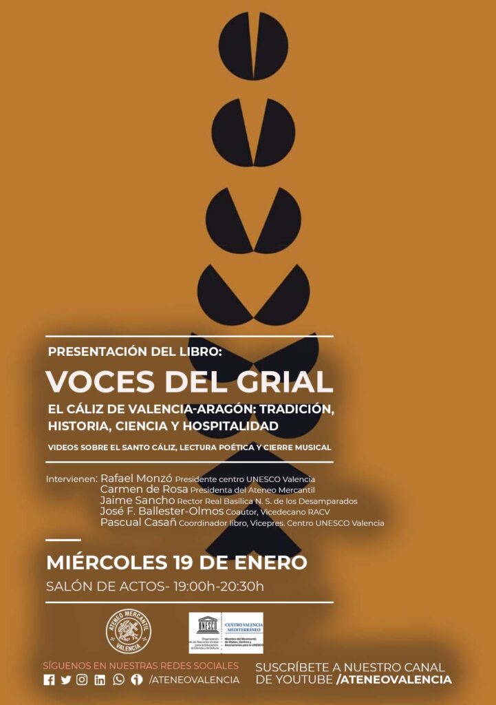 La presentación del libro "Voces del Grial. El Cáliz de Valencia-Aragón: Tradición, Historia, Ciencia y Hospitalidad" será el próximo miércoles 19 de enero a las 19 horas en el Salón de Actos del Ateneo Mercantil de Valencia. Un acto en el que intervendrán Rafael Monzó, Presidente Centro UNESCO Valencia-Mediterráneo, Carmen de Rosa, Presidenta del Ateneo Mercantil, Jaime Sancho, Rector de la Real Basílica de Ntra. Sra. De los Desamparados, José F. Ballester-Olmos, Coautor del libro y Vicedecano de la Real Academia de Cultura Valenciana y Pascual Casañ, Coordinador de la obra y Vicepresidente del Centro UNESCO Valencia-Mediterráneo.