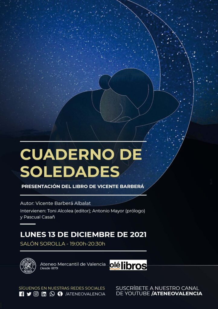 El próximo lunes 13 de diciembre a las 19 horas en el Salón Sorolla del Ateneo Mercantil se celebrará la presentación del último libro del poeta, Vicente Barberá, "Cuaderno de Soledades". Un acto en el que intervendrán el porpio autor de este gran poemario y al que le acompañarán el editor de la obra y fundador de la editorial valenciana Olé Libros, Toni Alcolea, el autor del prólogo del poemario, Antonio Mayor y el poeta Pascual Casañ.