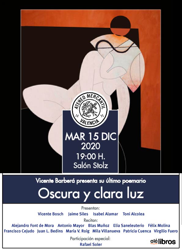 El próximo martes 15 de diciembre se presenta en el Salón Stolz del Ateneo Mercantil de Valencia a las 19 horas el último poemario de Vicente Barberá, "Oscura y clara luz", que viene a cerrar la trilogía amorosa que Vicente Barberá empezó en 2014 con De amor y sombras. Luego, en 2018, se publicó Después del amor y quedaba un tercer libro para cerrar el ciclo que es este esperado Oscura y clara luz. En él se trata del amor entendido como pérdida, añoranza, platónico, destrozado, canalla, enamoramiento, filial, frustrado, intrascendente, juvenil, hiperbólico, recuperado, perdido, de pareja, etc.