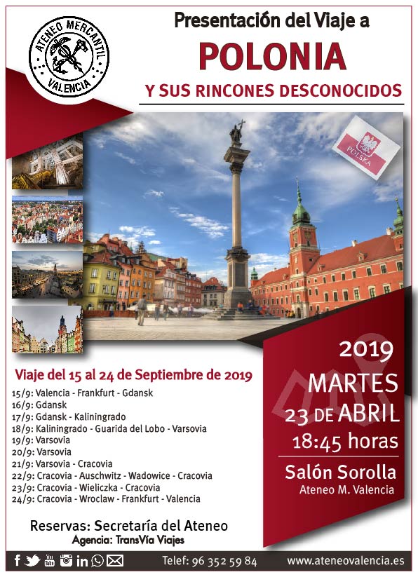 Tras el brillante viaje a Japón, le llega el turno a Polonia. Un país desconocido para muchas personas pero con una gran historia detrás y sobre todo con rincones maravillosos que son una delicia para los viajeros. El martes 23 de abril en el Salón Sorolla a las 18.45 horas se producirá la presentación de un viaje que organiza la agencia TransVía Viajes y que se llevará a cabo tras las vacaciones de verano y será desde el 15 al 24 de septiembre y que llevará a los socios del Ateneo Mercantil por lugares emblemáticos como Varsovia, Cracovia, Wroclaw, Wieliczka, Kaliningrado, Gdansk, Wadowice y Auschwitz: