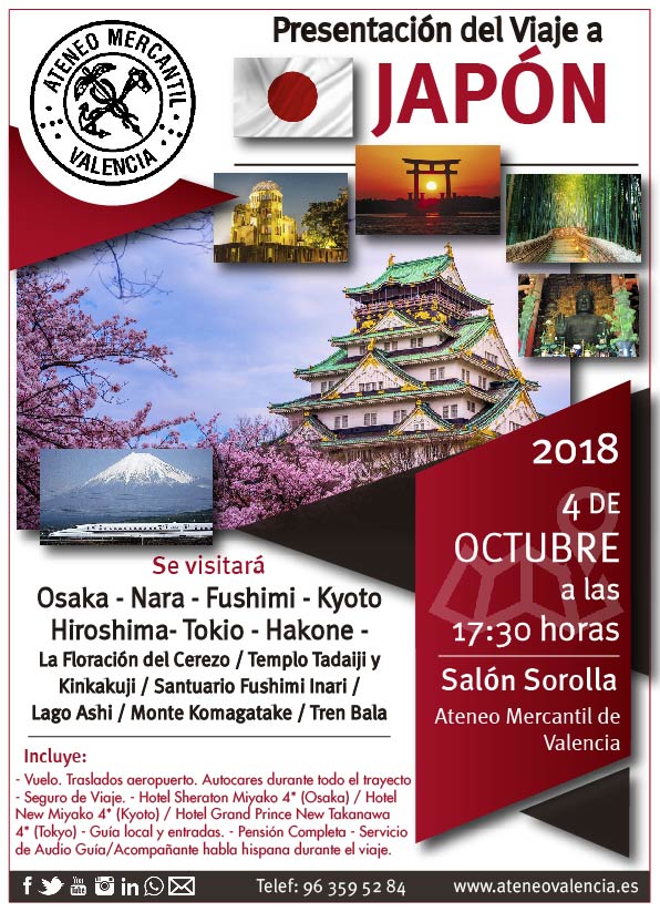 El próximo 4 de octubre de 2018 tendrá lugar, en el Salón Sorolla, a las 17:30 horas, la presentación del Viaje a Japón. Hoy la jornada tan sólo es informativa, por lo que las inscripciones al viaje no se abrirán hasta dentro de unos días. Avisaremos por los canales informativos del Ateneo Mercantil. En el viaje se visitará entre otros lugares: Osaka - Nara - Fushimi - Kyoto - Hiroshima- Tokio - Hakone - La Floración del Cerezo / Templo Tadaiji y Kinkakuji / Santuario Fushimi Inari / Lago Ashi / Monte Komagatake / Tren Bala.