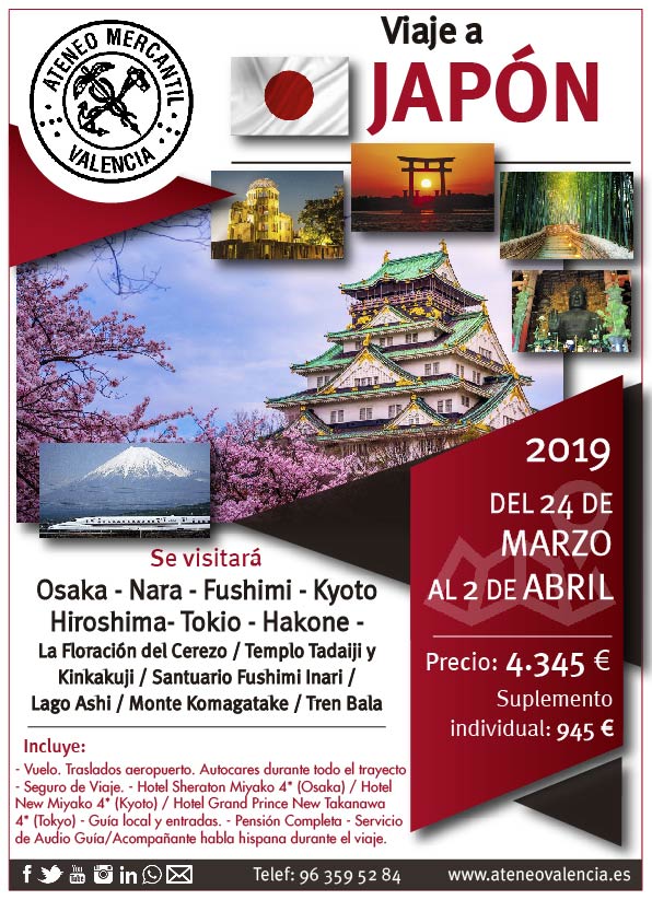 Los socios del Ateneo Mercantil de Valencia visitarán Japón en el momento de floración de cerezo, el instante más bonito para hacerlo. Así podrán visitar Osaka, Nara, Fushimi, Kyoto, Hiroshima, Tokio, Hakone, los Templos de Tadaiji y de Kinkakuji, el Santuario Fushimi Inari, el Lago Ashi y el Monte Komagatake. Además, se conocerá de cerca el Tren Bala.