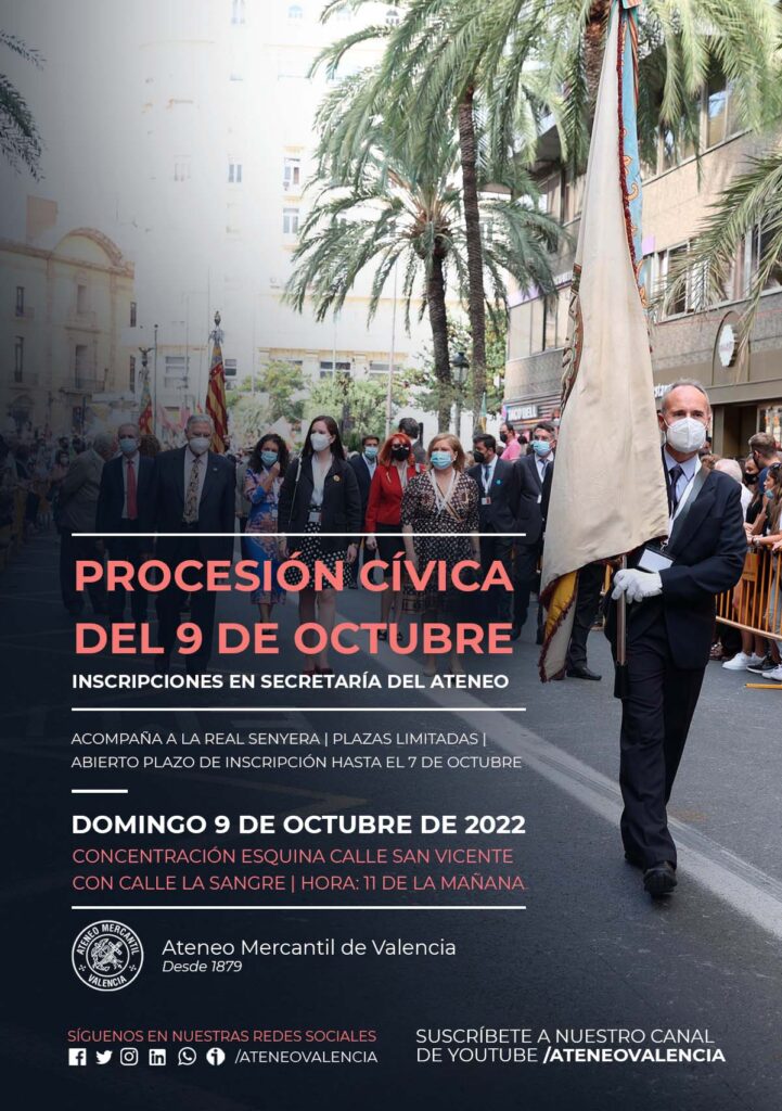 Los socios/as del Ateneo Mercantil de Valencia tienen la oportunidad de acompañar a la Real Senyera en la Procesión Cívica del 9 de Octubre. Los que quieran desfilar deberán apuntarse previamente en Secretaría del Ateneo Mercantil (5ª Planta) porque las plazas son limitadas. La citación será a las 11 horas en la esquina de calle San Vicente con calle La Sangre para recoger la acreditación que permite salir en grupo con la centenaria bandera del Ateneo Mercantil.