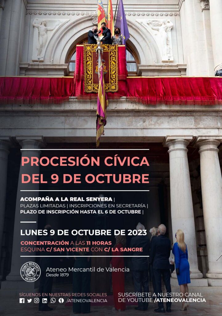 Los socios/as del Ateneo Mercantil de Valencia tienen la oportunidad de acompañar a la Real Senyera en la Procesión Cívica del 9 de Octubre. Los que quieran desfilar deberán apuntarse previamente en Secretaría del Ateneo Mercantil (5ª Planta) porque las plazas son limitadas. La citación será a las 11 horas en la esquina de calle San Vicente con calle La Sangre para recoger la acreditación que permite salir en grupo con la centenaria bandera del Ateneo Mercantil.