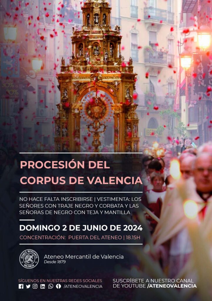 El próximo domingo 2 de junio de 2024 tendrá lugar en Valencia la Solemne Procesión del Corpus y los socios del Ateneo Mercantil pueden estar en ella si lo desean. La convocatoria es a las 18.15 horas en la Puerta Principal del edificio, con el Dress Code: señores de traje negro y las señoras con vestido negro, teja y mantilla negra. No hace falta inscribirse.