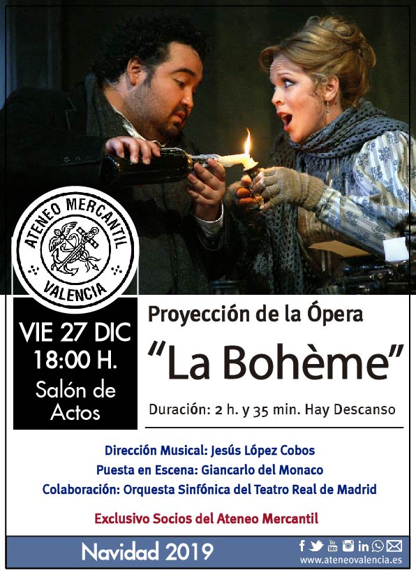No todos los eventos navideños van a estar dirigidos a los más pequeños, el Ateneo Mercantil también ha pensado en sus socios y socias estas fiestas y por eso el viernes 27 de diciembre a las 18 horas en el Salón de Actos se proyectará la ópera de Giacomo Puccini “La Bohème” (2 horas y media de duración) que se grabó en 2006 en el Teatro Real de Madrid. Esta ópera de Puccini llega con la dirección musical de Jesús López Cobos, con la puesta en escena de Giancarlo del Monaco y que interpretan magistralmente Inva Mula y Aqules Machado, además de contar con la colaboración y los coros de la Orquesta Sinfónica del Teatro Real de Madrid.