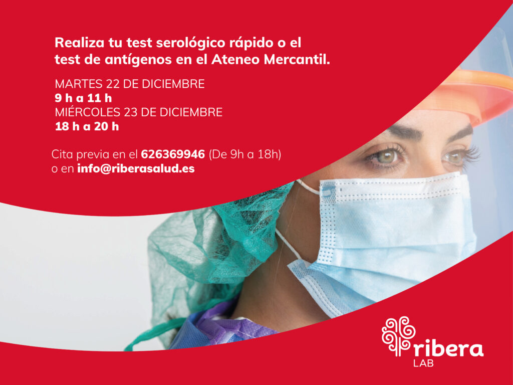 El Ateneo Mercantil de Valencia pone a disposición de sus socios y familiares, la posibilidad de realizarse el test serológico rápido o el test antigénico para la detección de la Covid19, con un precio de 40€, con resultado inmediato. Ribera Lab, la división de laboratorio del grupo Ribera, realizará las pruebas los días 22 y 23 de diciembre en la Sala de Ocio (Arriba de la chimenea del Salón Noble). Es imprescindible cita previa.