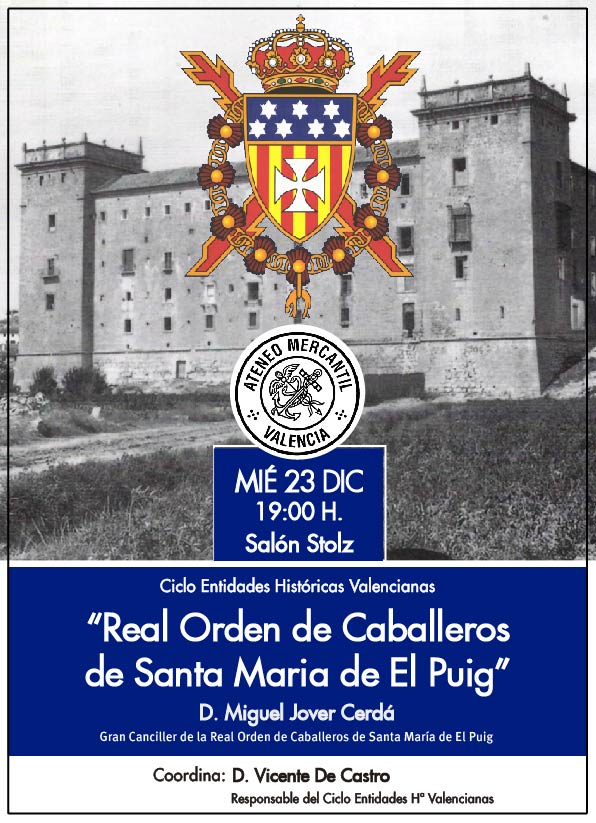 Antes de las vacaciones de Navidad, el Ciclo de Entidades Históricas Valencianas se despide con un institución que tuvo un gran calado en el Reino de Valencia. Una conferencia que llega bajo el título "Real Orden de Caballeros de Santa Maria de El Puig" y que impartirá el Gran Canciller de la Real Orden de Caballeros de Santa María de El Puig, D. Miguel Jover Cerdá. La conferencia será el próximo miércoles 23 de diciembre a las 19 horas en el Salón Stolz del Ateneo Mercantil. Una ponencia que repasará toda la historia de la orden y en qué momento se encuentra en la actualidad.
