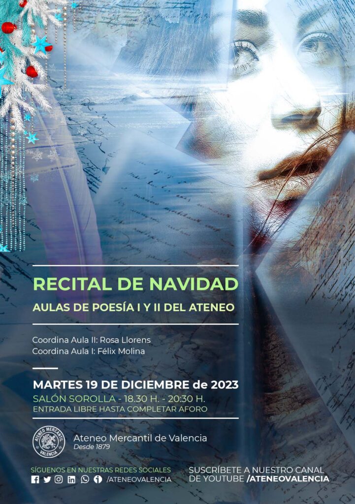 Las Aulas de Poesía 1 y 2 del Ateneo Mercantil de Valencia han programado un recital poético para el próximo martes 19 de diciembre en el Salón Sorolla en la que los miembros de ambas aulas recitarán poemas de temática libre, sobre todo, temas navideños.