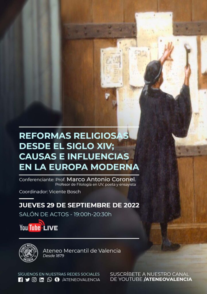 La conferencia llega el próximo jueves 29 de septiembre a las 19 horas en el Salón de Actos del Ateneo Mercantil y el ponente es el Prof. Marco Antonio Coronel, profesor de Filología de la Universitat de València, poesta y ensayista. Una conferencia que tratará de responder varias cosas: ¿Cómo influyeron las reformas en los demás ámbitos culturales?, ¿qué relación hubo entre las reformas religiosas?... Se intentará ofrecer una cierta visión panorámica, que nos permita conocer una síntesis significativa sobre estas cuestiones.