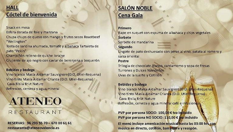 RESERVAS (Hasta completar Aforo): 962.93.55.70 / 670.00.61.61 / restaurante@ateneovalencia.es