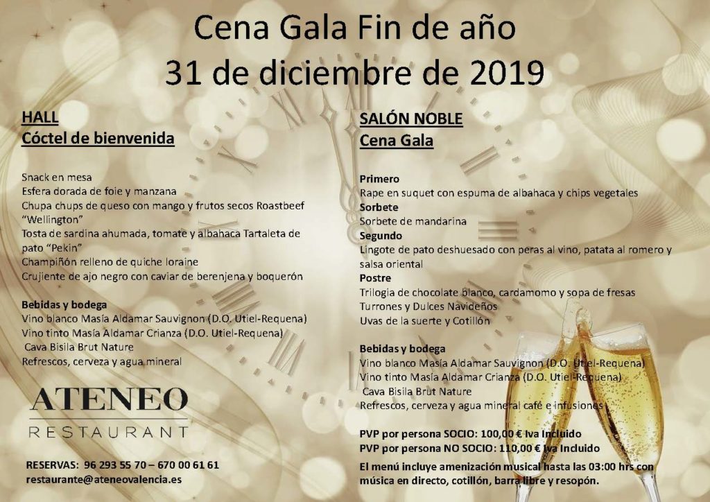 Ya puedes reservar tu plaza en el Ateneo Mercantil para vivir una Nochevieja de ensueño. Recuerda que los tickets de venta se pueden ya sacar en el Restaurante (sexta planta del edificio) o bien reservando en el teléfono 96.293.55.70 y 670.00.61.61 para abonar los 100 euros de coste para los socios y socias ateneístas y los 110 euros si no lo eres. Dale la bienvenida al año 2020 rodeado de amigos y en el mejor entorno posible, en nuestro Ateneo Mercantil de Valencia y desde la Plaza del Ayuntamiento, centro neurálgico de la Nochevieja valenciana. Una cena con todo lujo de detalles, con barra libre, cotillón gratis y resopón. Además, habrá baile hasta las 3.00 horas de la madrugada. La cena se servirá en el Salón Noble por el grupo de restauración que trabaja en el Ateneo Mercantil, Grupo El Alto.