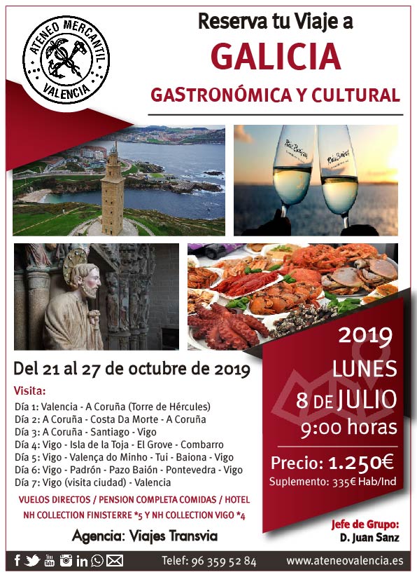 Conoce Galicia tanto gastronómica como culturalmente; un viaje que llevará a los socios del Ateneo Mercantil y acompañantes a la tierra del mejor marisco y del Albariño. El viaje se realizará con Viajes TransVía del 21 al 27 de octubre de 2019. Recuerda que los vuelos son directos (Valencia-A Coruña-Valencia), hoteles de 4* (NH COLLECTION VIGO) y de 5* (NH COLLECTION FINISTERRE en A Coruña) son céntricos.