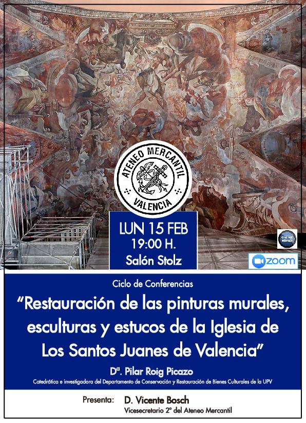 El Ciclo de Conferencias regresa al Ateneo Mercantil el próximo lunes 15 de febrero a las 19 horas con una ponencia especial que llega bajo el título "Restauración de las pinturas murales, esculturas y estucos de la Iglesia de Los Santos Juanes de Valencia" y que nos contará como ha arrancado la restauración del templo que comenzó tan sólo hace unos meses. La ponente será la catedrática e investigadora del Departamento de Conservación y Restauración de Bienes Culturales de la UPV, Dª. Pilar Roig Picazo.
