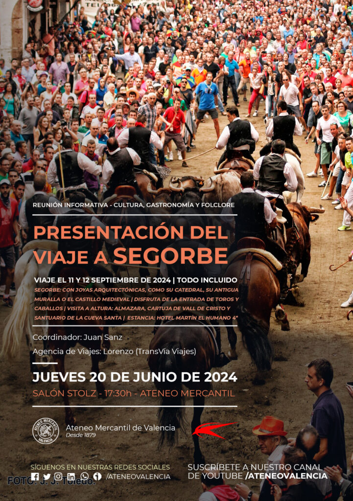 El Ateneo Mercantil de Valencia y nuestra agencia de confianza TransVía Mucho más que Viajes presentan un nuevo viaje en el que se aunará la Cultura, la Gastronomía y el Folclore. La reunión de este viaje a Segorbe y Altura será el próximo jueves 20 de junio a las 17.30 horas en el Salón Stolz del Ateneo.